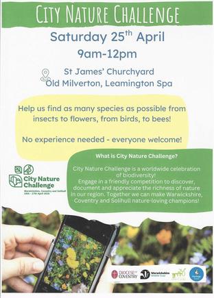 Here at St James, we will be joined at our Dog Walkers’ coffee morning on Saturday 25th April by the diocesan biodiversity team as we join in with the City Nature Challenge. The aim of this is to identify as many different species that live in and around our churchyard as possible. You don’t have to be knowledgeable, just take a photo on your phone and share your findings with the team who will be able to tell you what you’ve found (I’m going to make use of my Merlin bird App as well).