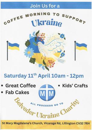 On Saturday 11th April, St Mary Magdalene are holding a coffee morning in aid of the Belveder Ukraine Charity (who we support through our collection box at the back of church). Go along and enjoy coffee and cake if you can.